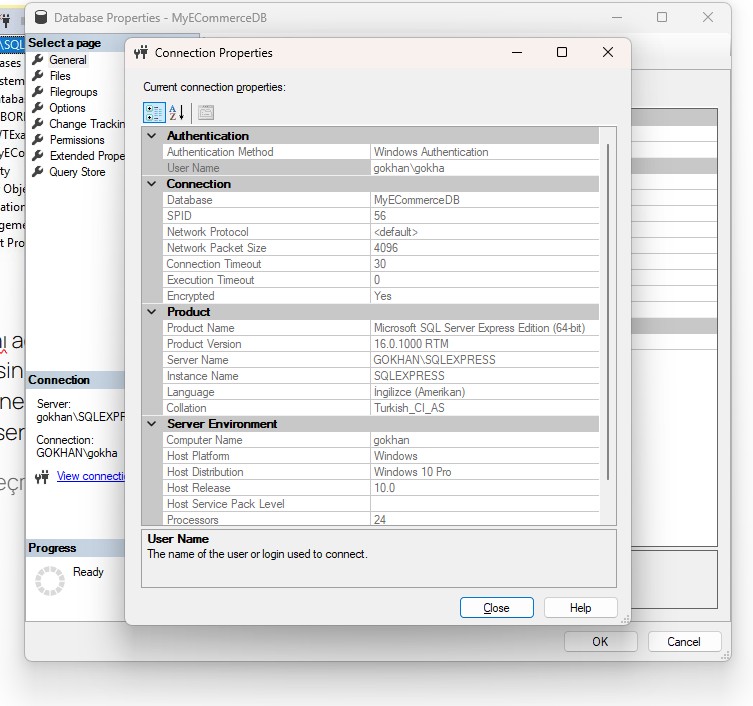 Veritabanı adına da listelenen veritabanları üzerinden ulaşabilirsiniz. Aynı şekilde veritabanına sağ tıklayarak Properties > View Connection Properties bağlantısı üzerinden de veritabanı adına ve server adresine ulaşabilirsiniz.
