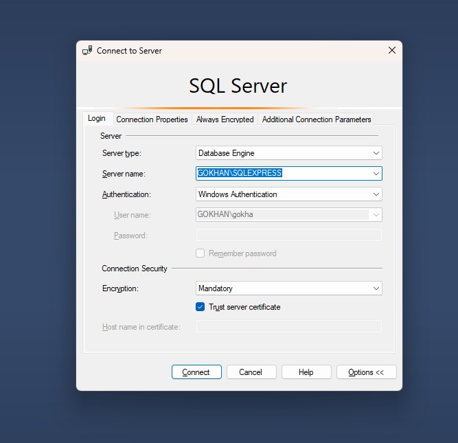 Burada “Server Name” yazan yerde hali hazırda conneciton string için “Server” Kısmı bulunmaktadır ve gördüğünüz gibi Authenticationkısmı da “Windows Authentication” yani şifre gerektirmeyen bir yöntemdir.